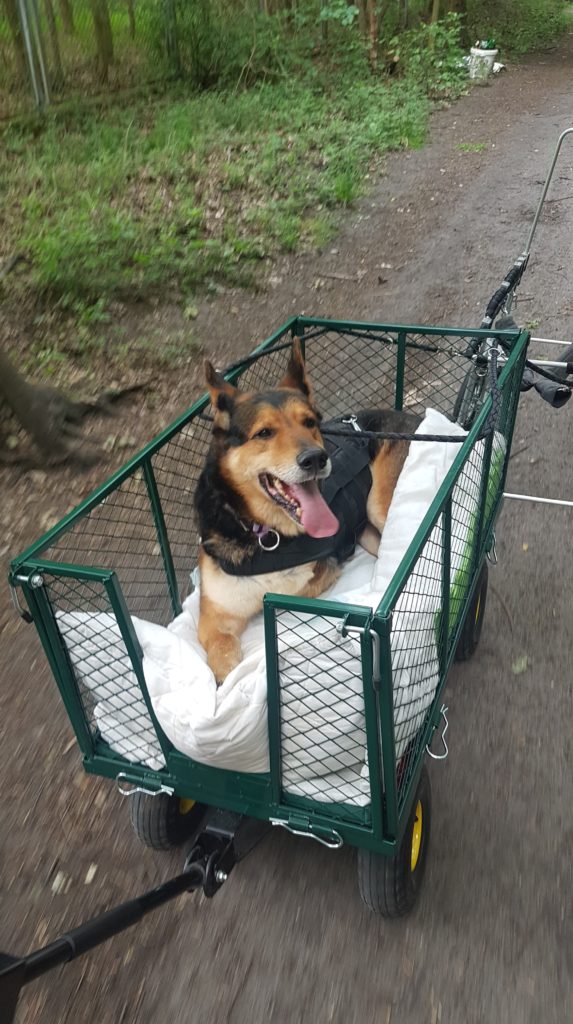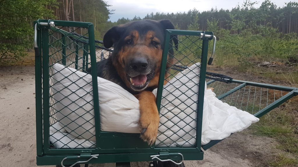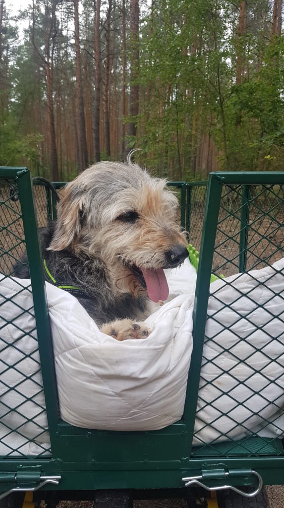 I ona właśnie, ta dwunożna psiolontariuszka, kiedy Brutek był już słabszy, to poprosiła, żeby kupić taki wózeczek, którego zwykle używa się w ogródkach, ale przydałby się idealnie do wożenia czterołapa na spacerach, kiedy już nie miał siły iść, a inni jeszcze biegali. Sprawdzał się idealnie! Potem, kiedy… no wiecie… kiedy Brutkowi nie był już potrzebny, to przejęła go Bati: